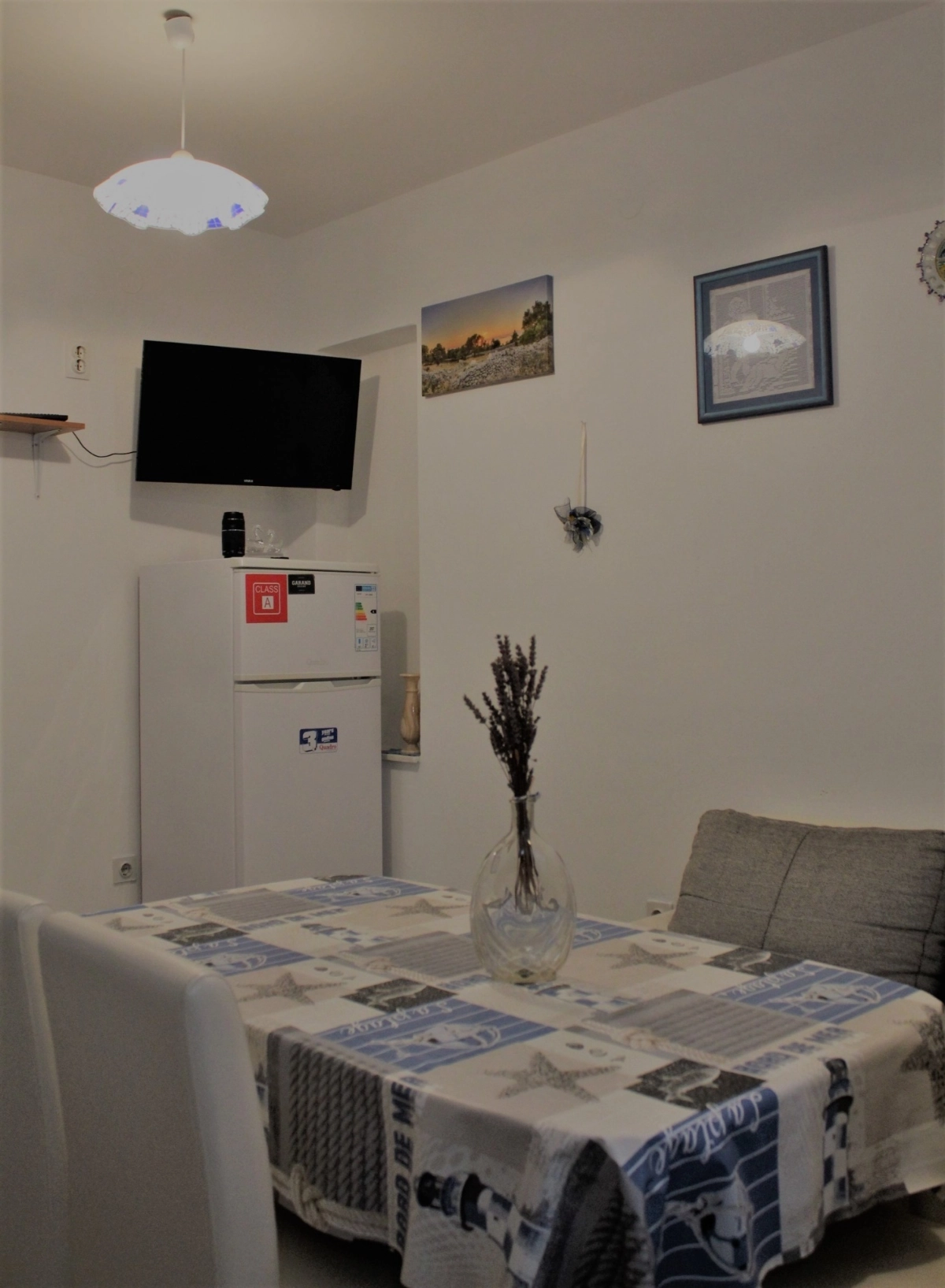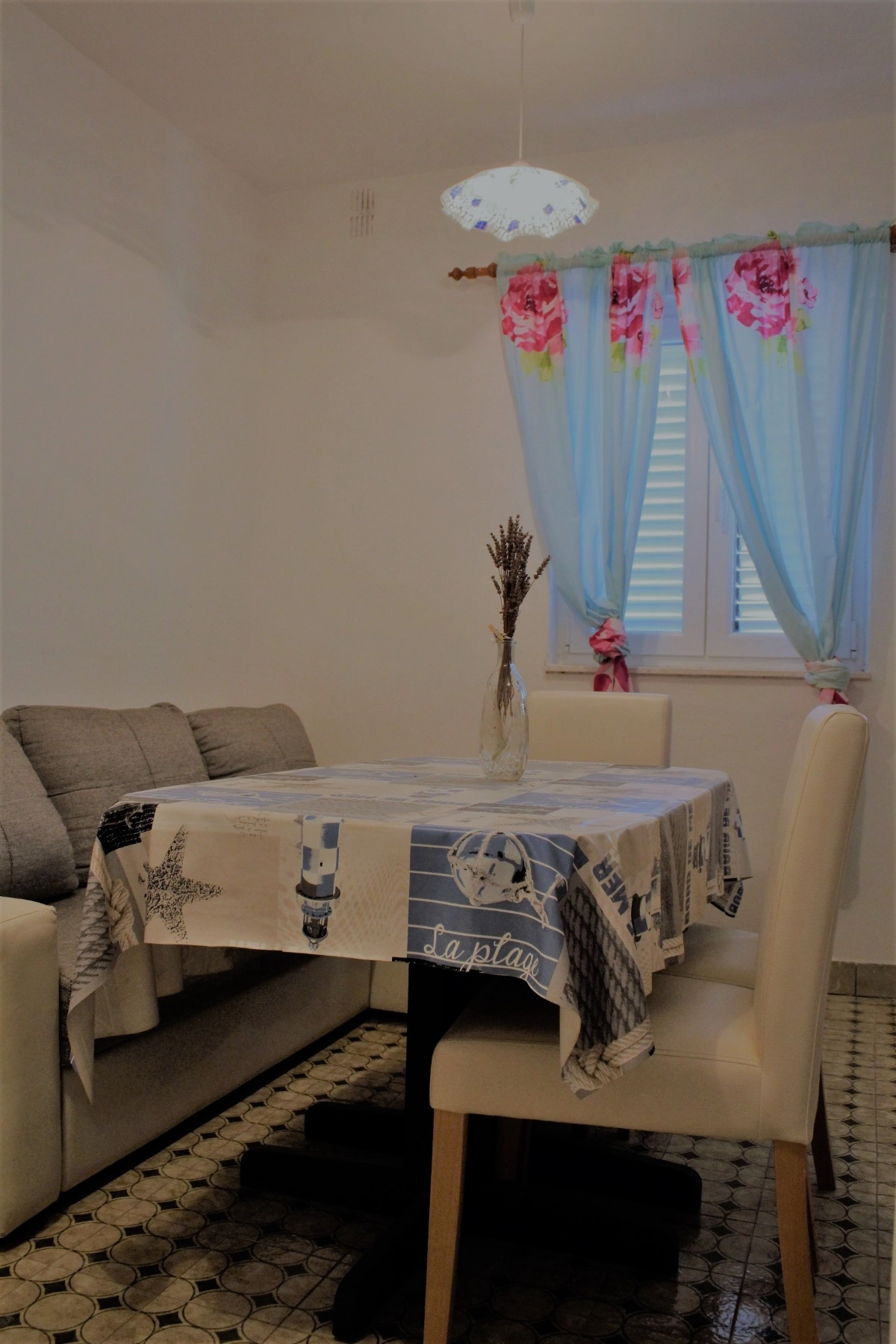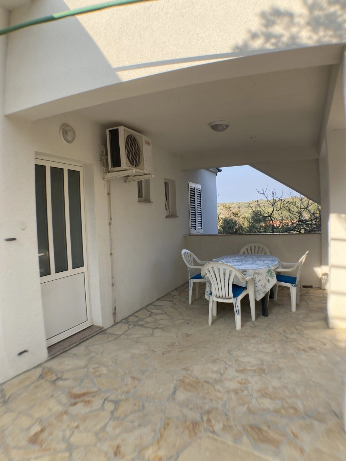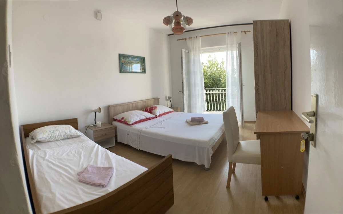 Un appartement pour 4+2 personnes, qui dispose de 70 m², avec une terrasse et un balcon, une cuisine ouverte sur la salle à manger, deux chambres triples, une salle de bain avec douche, un barbecue, climatisation et Parking