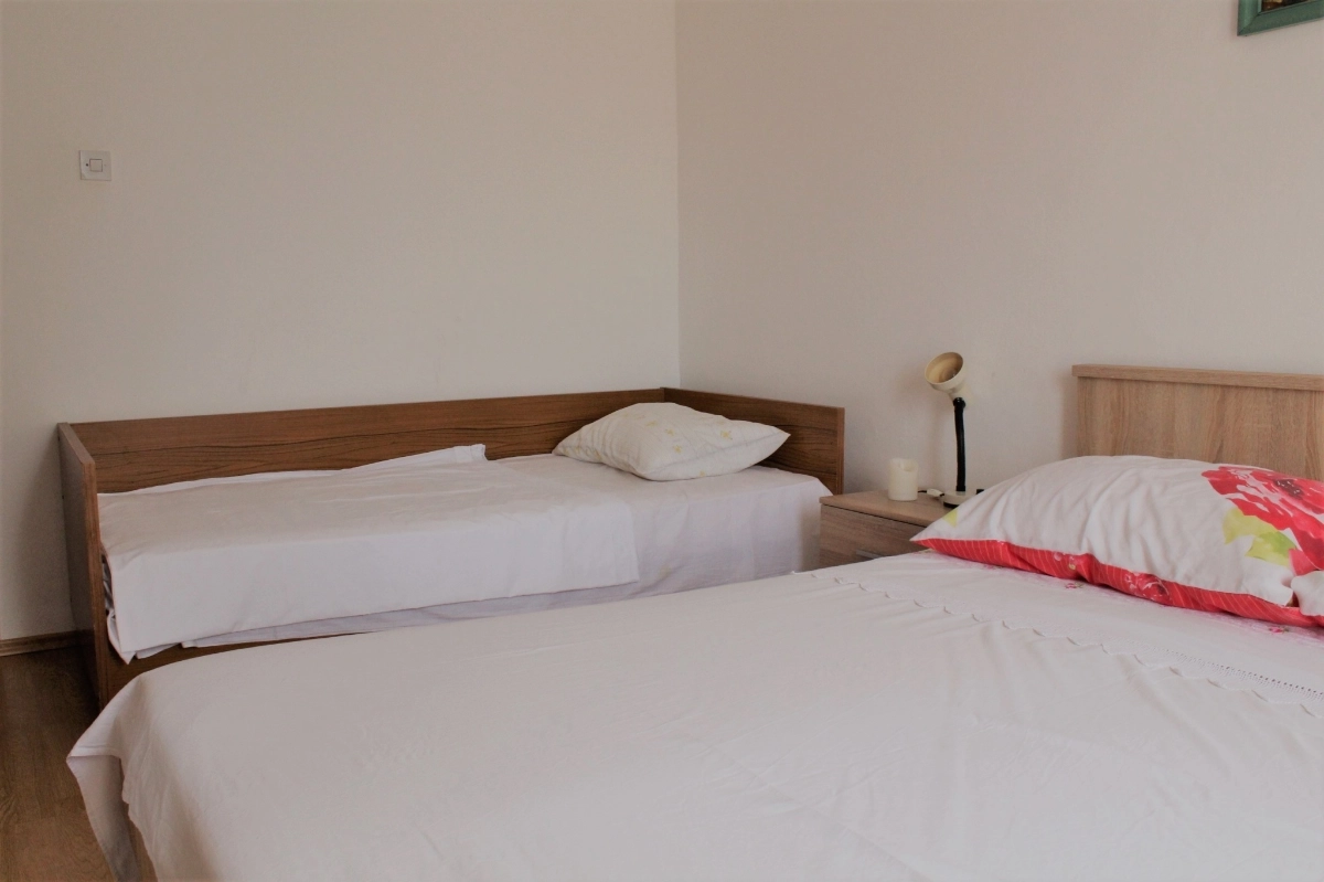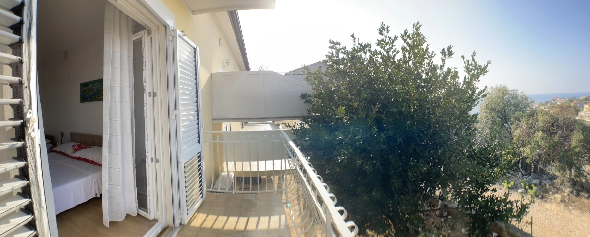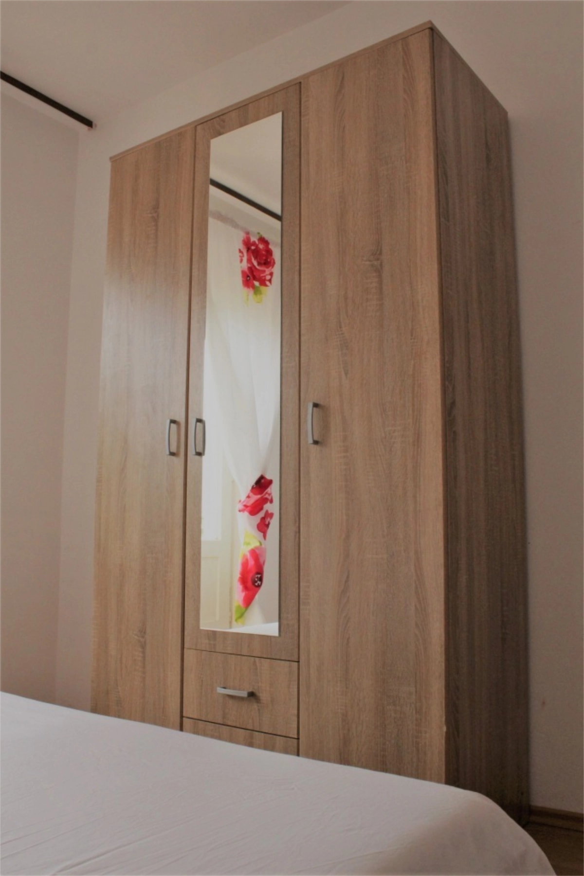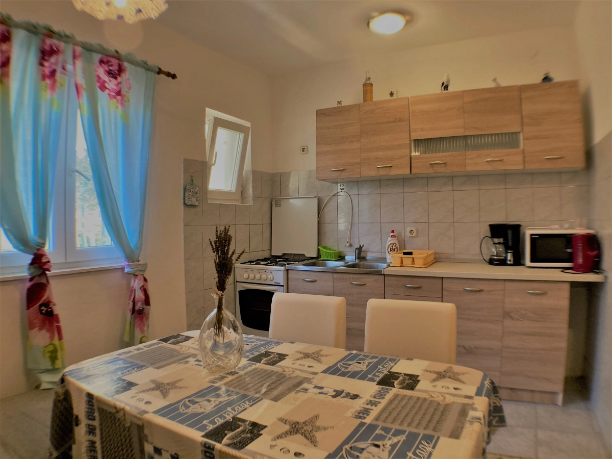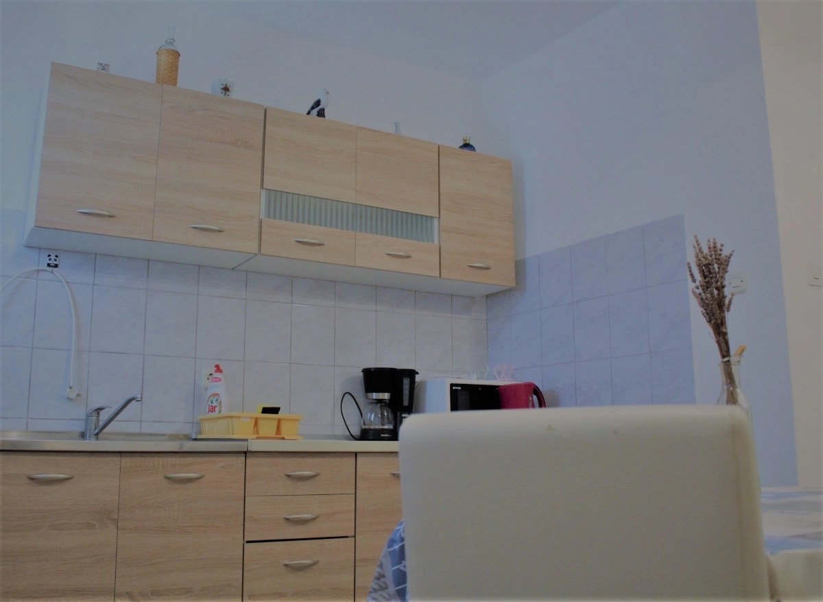 Un appartement pour 4+2 personnes, qui dispose de 70 m², avec une terrasse et un balcon, une cuisine ouverte sur la salle à manger, deux chambres triples, une salle de bain avec douche, un barbecue, climatisation et Parking